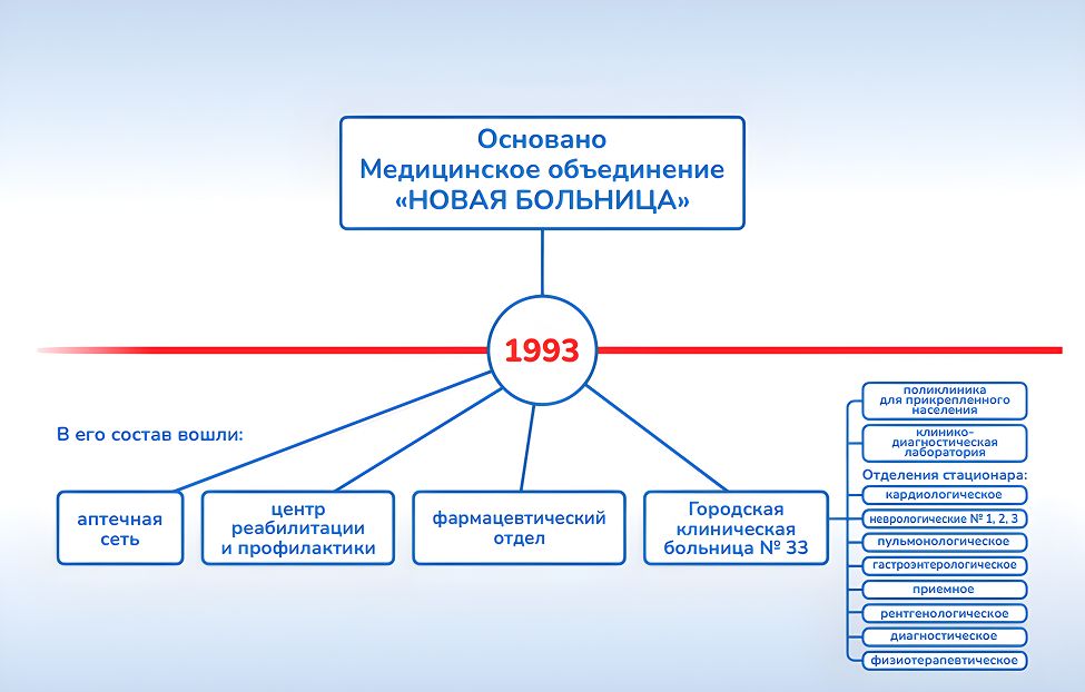 В 2026 году «Новая больница» отмечает 33 года со дня основания. В наше медицинское объединение входит крупная многопрофильная клиника, исторически известная горожанам и жителям нашего региона как городская клиническая больница №33. Мы расположены в сердце микрорайона ВИЗ, на Заводской, 33.